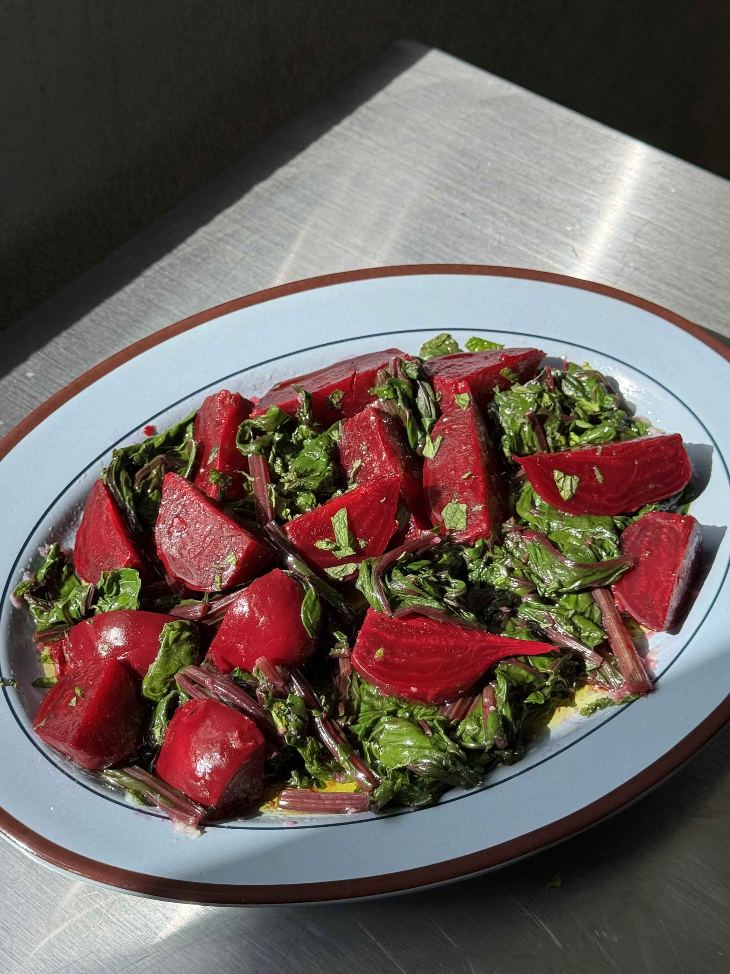 In a bowl combine, garlic, lemon juice, oil, mint leaves and season with salt flakes. Toss in the boiled beetroots and leaves and serve.
